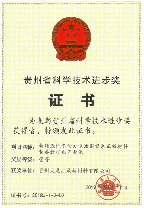 貴州大龍匯成新材料有限公司,聯合相關院校及企業(yè)申報的《新能源汽車動力電池用錳系正極材料制備新技術產業(yè)化》獲貴州省科學技術進步獎一等獎,并受到表彰。