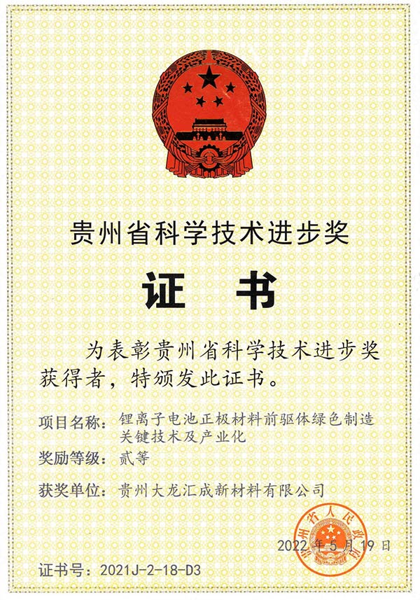 貴州大龍匯成新材料有限公司,聯(lián)合相關(guān)院校及企業(yè)申報的《鋰離子電池正極材料前驅(qū)體綠色制造關(guān)鍵技術(shù)及產(chǎn)業(yè)化》獲貴州省科學(xué)技術(shù)進(jìn)步獎二等獎。